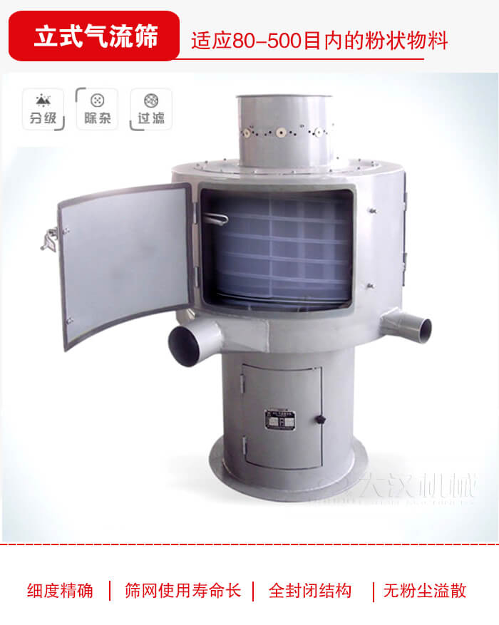 气流筛又称立式气流筛主要借助风机的风力带动物料投向筛网从而实现物料的筛分,主要范围在80-500目的粉状物料进行过网,筛网立装不荷重,全封闭结构,无粉尘溢散,气流筛型号有LQS600、LQS1000、LQS1600等常规型号。